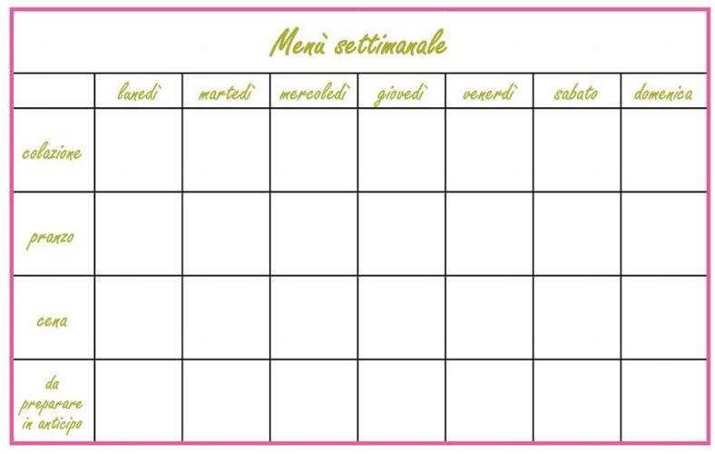 Eccovi qui una tabella di menù settimanale in pdf, cliccate per scaricarla ingrandita.
