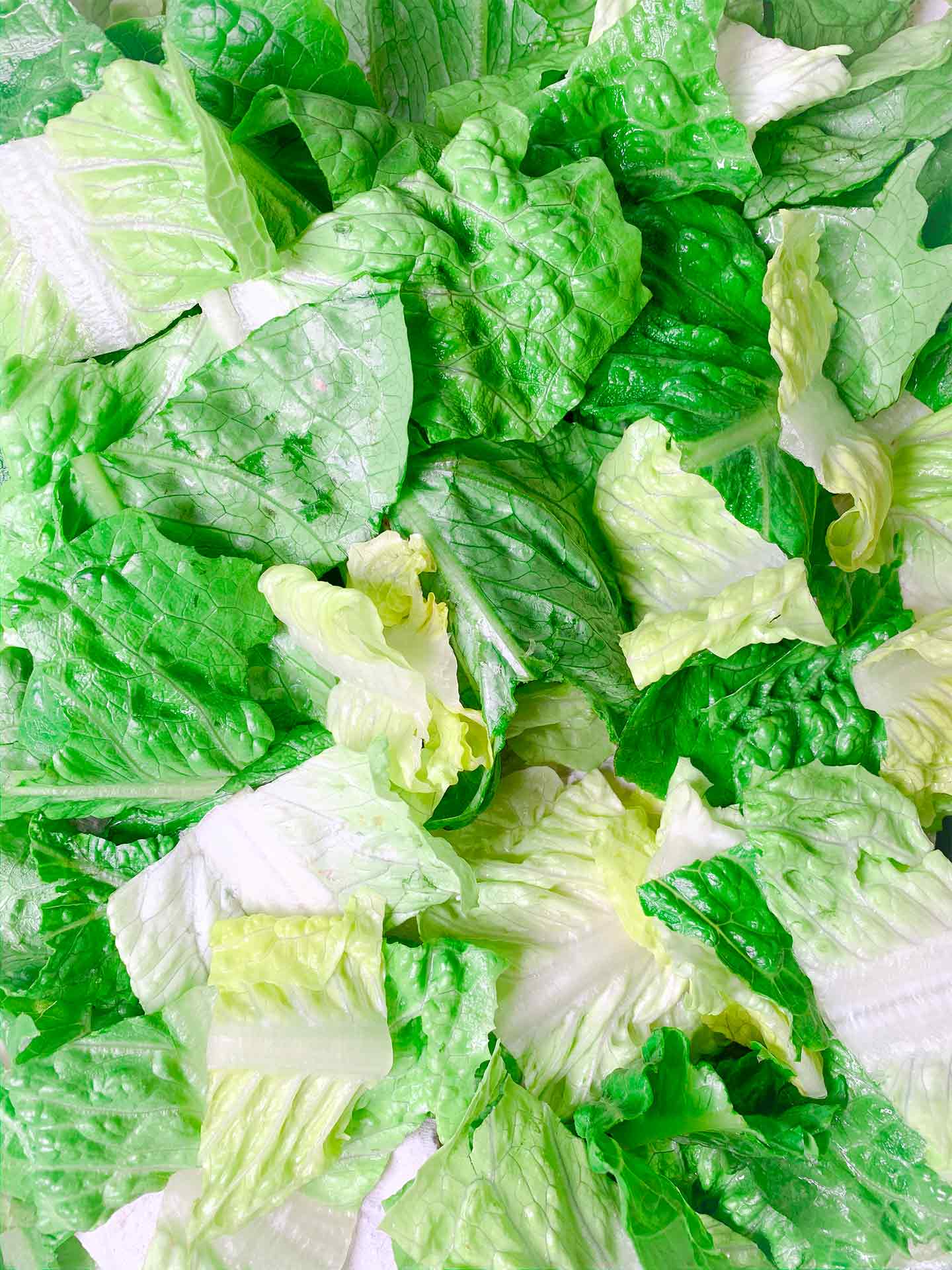 2. Mondare e lavare l’insalata iceberg, asciugarla e tagliare le foglie a striscioline.